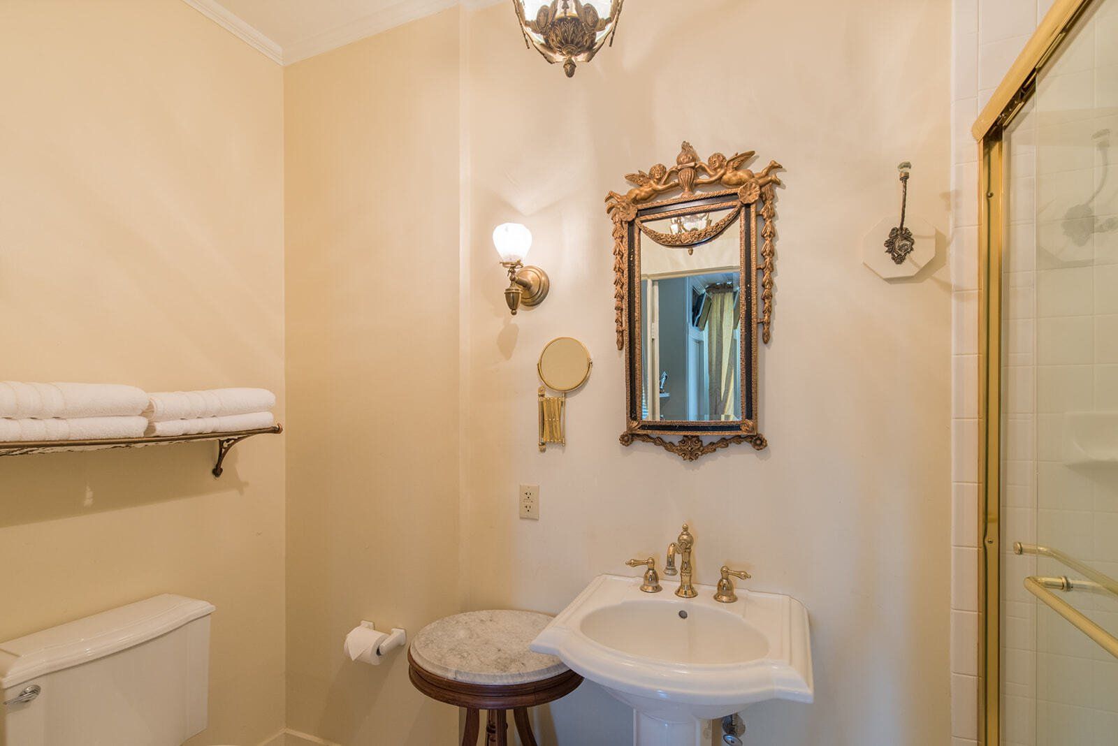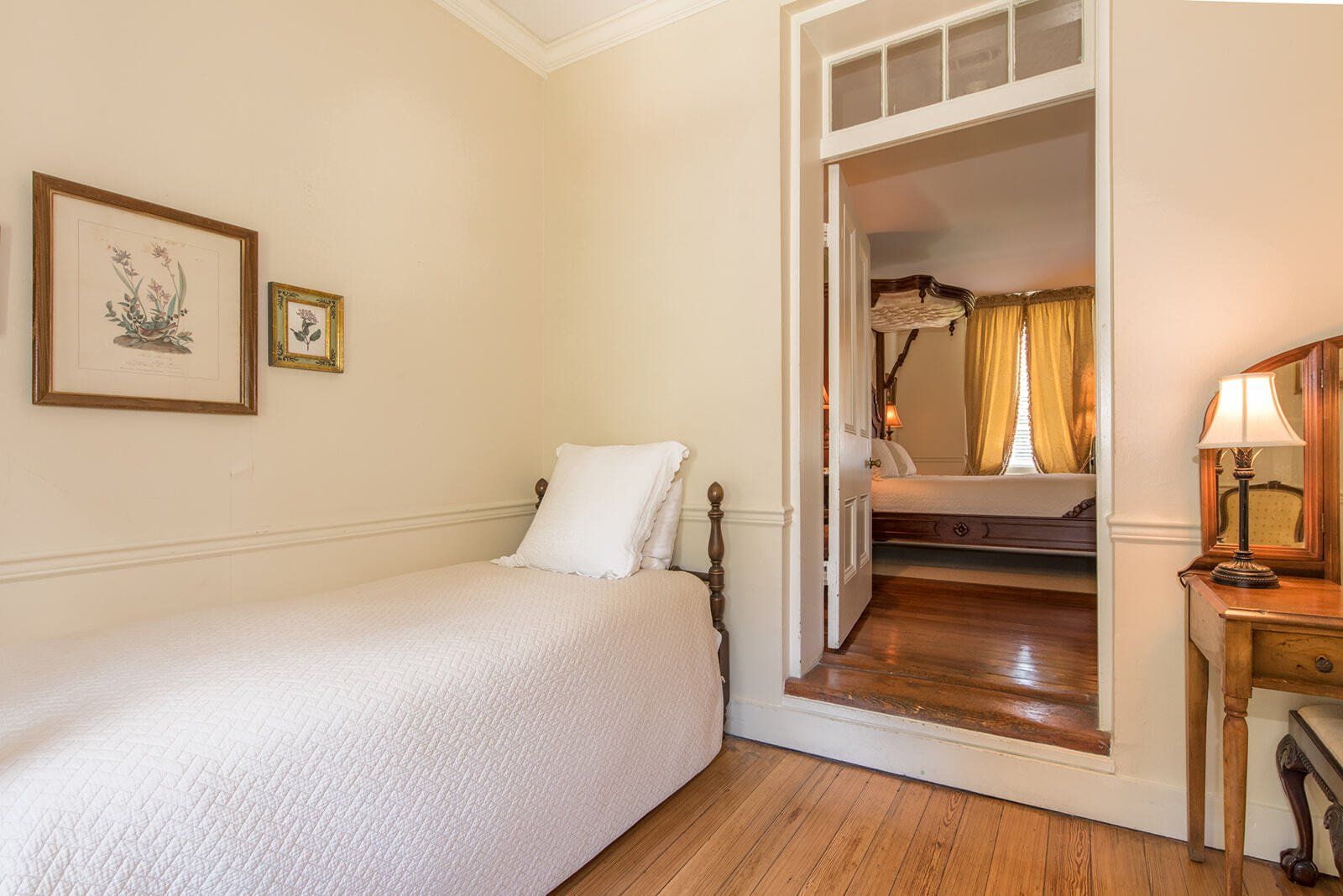 This luscious suite overlooks the garden from the The Burn Luxury Inn of Natchez, MS’s second floor. The room sleeps three adults comfortably, with a twin bed in one area and a queen half tester in the other. The bathroom is newly renovated with a shower.